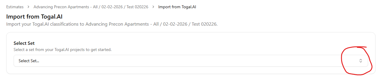 4. Select the desired "Set" from your Togal.AI projects from the dropdown options.
