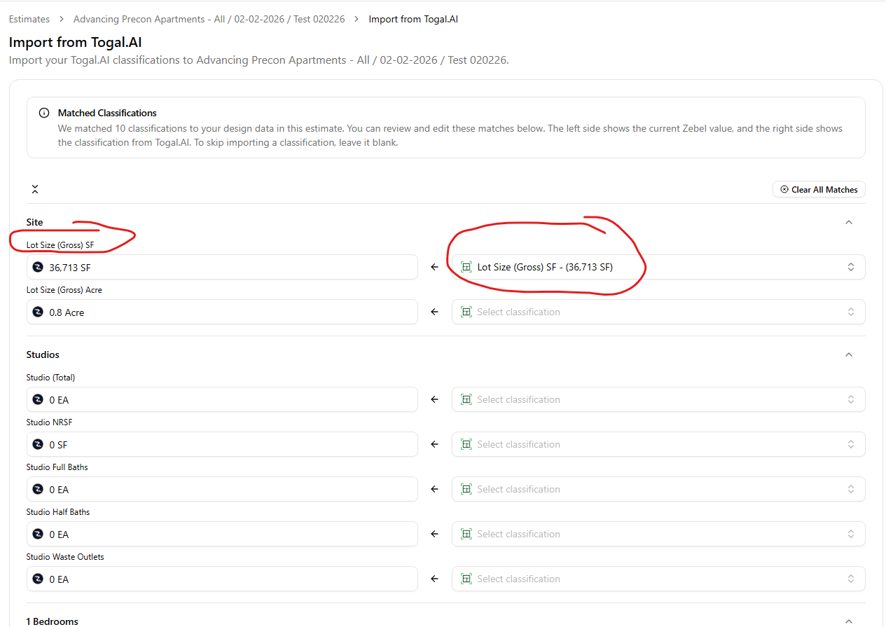 7. The left side shows the current Zebel value and the right side shows the classification value from Togal. AI. If you wish to skip importing a classification, leave it blank.
