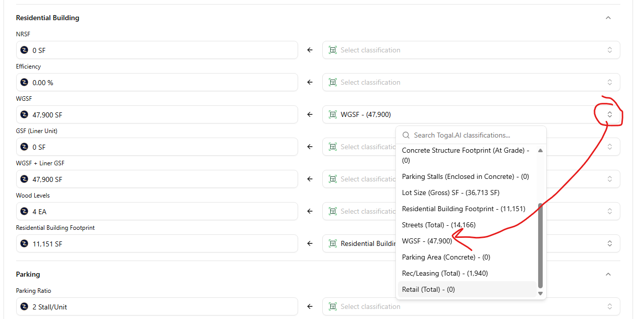 8. You have the ability to select the Togal. AI value in the right side by using the dropdown for each item. For example, if the input in the left is called "Site Area" and your Togal. AI classification on the right is "Site SF", the integration won't automatically match these due to the difference in name. However, you can manually match the "Site SF" value in the right to the "Site Area" field in the left.