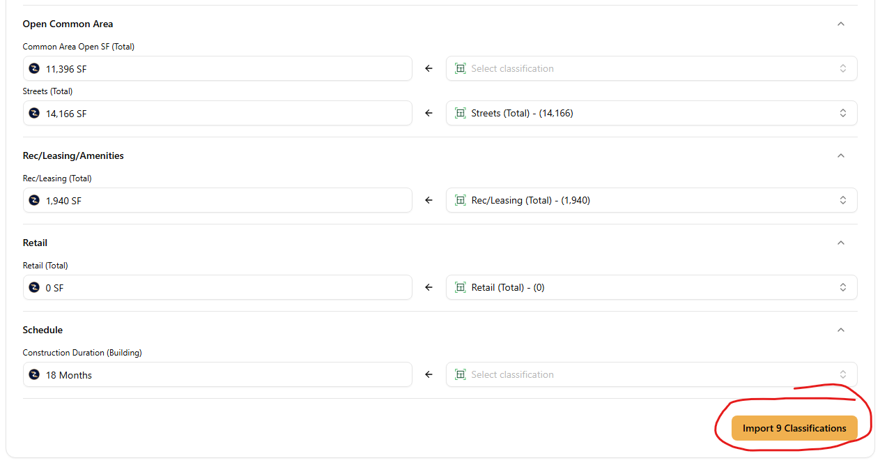 9. Once you are finished matching your Togal. AI classifications in the right to the inputs in the left, press the yellow "Import Classifications" button located in the bottom right corner.
