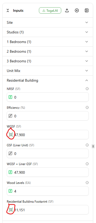 10. All the values imported from Togal. AI will have the Togal. AI logo to the left of each value in your inputs panel. When you hover over the logo it will show the user, date and time when the value was imported from Togal. AI. Ie. "Imported from Togal. AI by Jon Doe on February 2nd, 2026 at 12:30 PM".