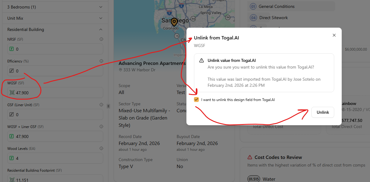 11. You have the ability to unlink values from Togal. AI. Simply click into the desired field in your inputs panel. A box will appear with the text "Unlink from Togal. AI" on the upper left corner. Check the "I want to unlink this design field from Togal.AI" checkbox and press the "Unlink" buttom located on the lower right corner.
